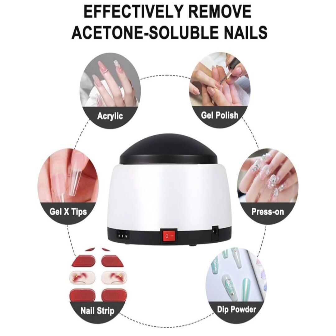 Afmetingen: 18 x 14 x 11 cm Stoomfunctie: Verwarmt aceton voor zachte, effectieve verwijdering Voeding: 110–240 V adapter (inclusief) Opwarmtijd: 2 minuten Compatibiliteit: Gel, acryl, dip powder & gewone nagellak Veiligheid: Automatische uitschakeling & anti-mors ontwerp